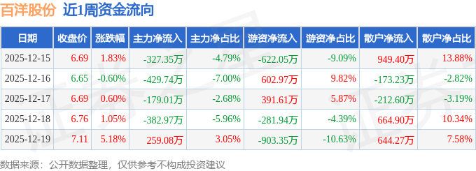 资金流向数据方面,本周百洋股份主力资金合计净流出1059.99万元,游资资金合计净流出812.75万元,散户资金合计净流入1872.74万元。本周资金流向一览见下表: