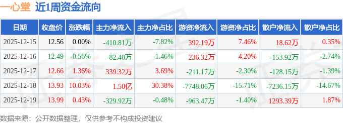 资金流向数据方面,本周一心堂主力资金合计净流入1.45亿元,游资资金合计净流出8294.18万元,散户资金合计净流出6206.22万元。本周资金流向一览见下表: