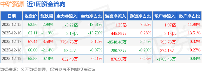 资金流向数据方面,本周中矿资源主力资金合计净流出4.56亿元,游资资金合计净流入5012.98万元,散户资金合计净流入4.06亿元。本周资金流向一览见下表: