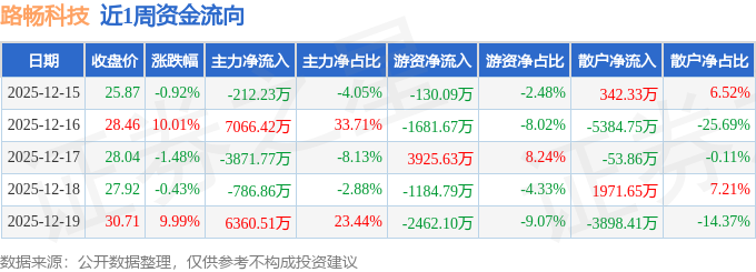 资金流向数据方面,本周路畅科技主力资金合计净流入8556.06万元,游资资金合计净流出1533.03万元,散户资金合计净流出7023.03万元。本周资金流向一览见下表: