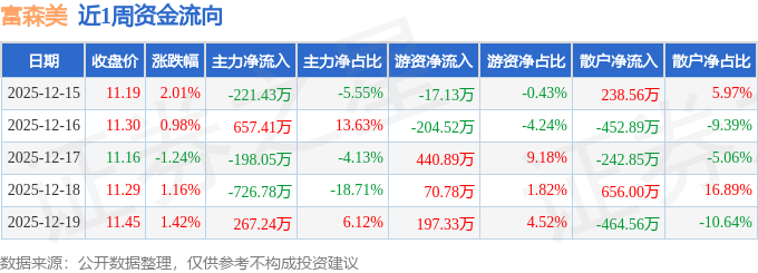 资金流向数据方面,本周富森美主力资金合计净流出221.62万元,游资资金合计净流入487.36万元,散户资金合计净流出265.74万元。本周资金流向一览见下表: