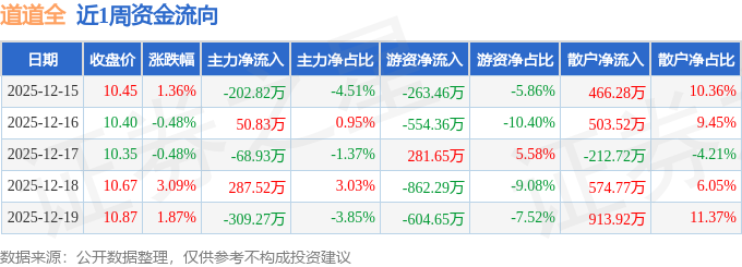 资金流向数据方面,本周道道全主力资金合计净流出242.65万元,游资资金合计净流出2003.11万元,散户资金合计净流入2245.76万元。本周资金流向一览见下表: