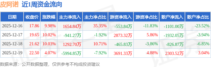 资金流向数据方面,本周皮阿诺主力资金合计净流出3988.59万元,游资资金合计净流入5544.99万元,散户资金合计净流出1556.4万元。本周资金流向一览见下表: