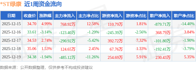资金流向数据方面,本周*ST绿康主力资金合计净流出5.87万元,游资资金合计净流入580.57万元,散户资金合计净流出574.71万元。本周资金流向一览见下表: