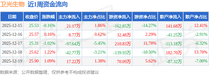 资金流向数据方面,本周卫光生物主力资金合计净流出93.24万元,游资资金合计净流入10.62万元,散户资金合计净流入82.62万元。本周资金流向一览见下表: