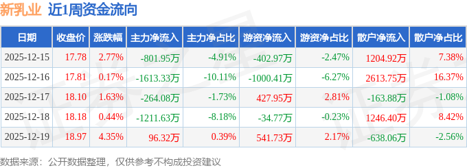 资金流向数据方面,本周新乳业主力资金合计净流出3794.67万元,游资资金合计净流出468.47万元,散户资金合计净流入4263.14万元。本周资金流向一览见下表: