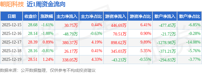 资金流向数据方面,本周朝阳科技主力资金合计净流入726.56万元,游资资金合计净流入1717.63万元,散户资金合计净流出2444.18万元。本周资金流向一览见下表: