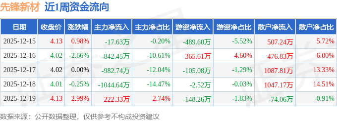 资金流向数据方面,本周先锋新材主力资金合计净流出2665.13万元,游资资金合计净流出379.85万元,散户资金合计净流入3044.98万元。本周资金流向一览见下表: