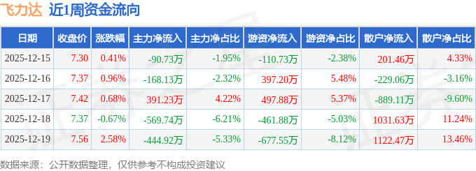 资金流向数据方面,本周飞力达主力资金合计净流出882.3万元,游资资金合计净流出355.09万元,散户资金合计净流入1237.39万元。本周资金流向一览见下表: