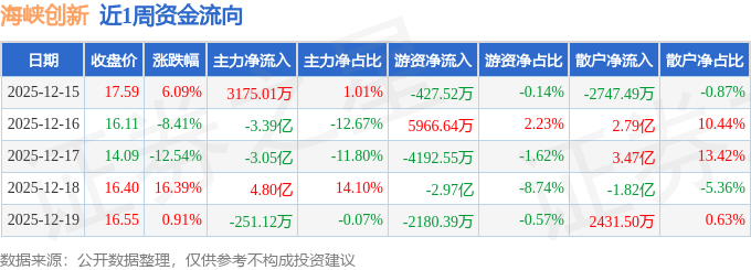 资金流向数据方面,本周海峡创新主力资金合计净流出1.35亿元,游资资金合计净流出3.06亿元,散户资金合计净流入4.4亿元。本周资金流向一览见下表: