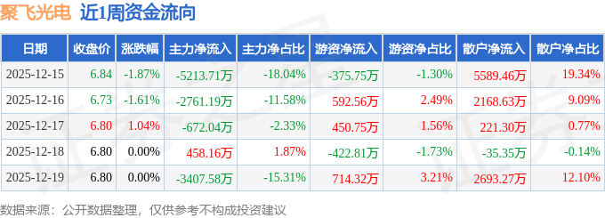 资金流向数据方面,本周聚飞光电主力资金合计净流出1.16亿元,游资资金合计净流入959.07万元,散户资金合计净流入1.06亿元。本周资金流向一览见下表: