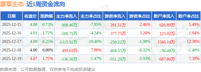 资金流向数据方面,本周蒙草生态主力资金合计净流出2362.54万元,游资资金合计净流出546.83万元,散户资金合计净流入2909.37万元。本周资金流向一览见下表: