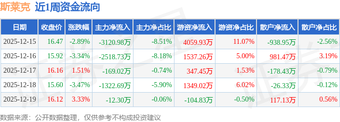 资金流向数据方面,本周斯莱克主力资金合计净流出7143.71万元,游资资金合计净流入7188.83万元,散户资金合计净流出45.12万元。本周资金流向一览见下表: