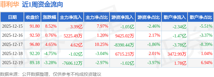 资金流向数据方面,本周菲利华主力资金合计净流入6.75亿元,游资资金合计净流出1.29亿元,散户资金合计净流出5.47亿元。本周资金流向一览见下表: