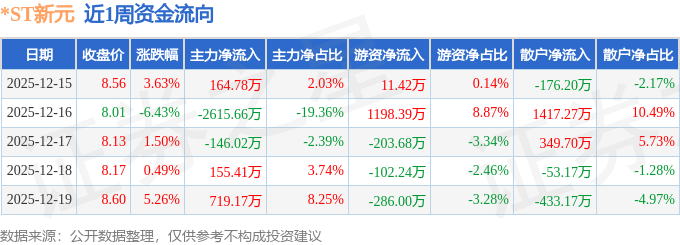 资金流向数据方面,本周*ST新元主力资金合计净流出1722.31万元,游资资金合计净流入617.89万元,散户资金合计净流入1104.42万元。本周资金流向一览见下表: