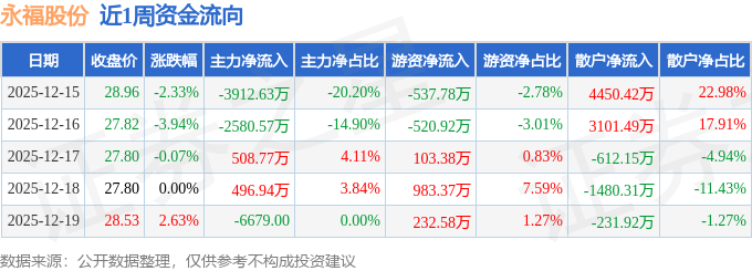 资金流向数据方面,本周永福股份主力资金合计净流出5488.16万元,游资资金合计净流入260.63万元,散户资金合计净流入5227.53万元。本周资金流向一览见下表: