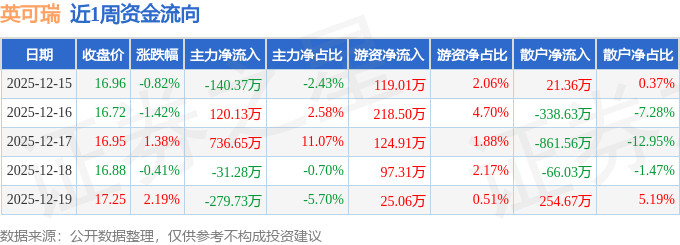 资金流向数据方面,本周英可瑞主力资金合计净流入405.4万元,游资资金合计净流入584.79万元,散户资金合计净流出990.19万元。本周资金流向一览见下表: