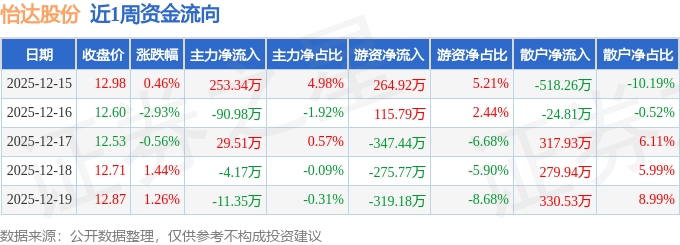 资金流向数据方面,本周怡达股份主力资金合计净流入176.35万元,游资资金合计净流出561.69万元,散户资金合计净流入385.33万元。本周资金流向一览见下表: