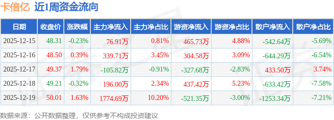 资金流向数据方面,本周卡倍亿主力资金合计净流入2281.49万元,游资资金合计净流入358.7万元,散户资金合计净流出2640.18万元。本周资金流向一览见下表: