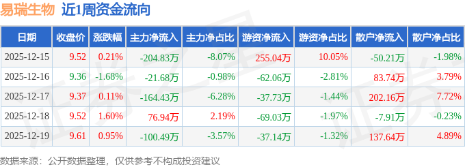 资金流向数据方面,本周易瑞生物主力资金合计净流出414.49万元,游资资金合计净流入49.08万元,散户资金合计净流入365.42万元。本周资金流向一览见下表: