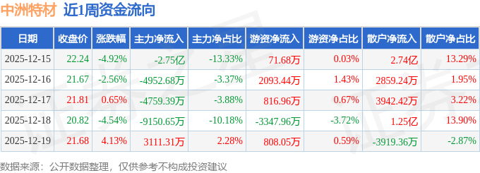 资金流向数据方面,本周中洲特材主力资金合计净流出4.33亿元,游资资金合计净流入442.18万元,散户资金合计净流入4.28亿元。本周资金流向一览见下表: