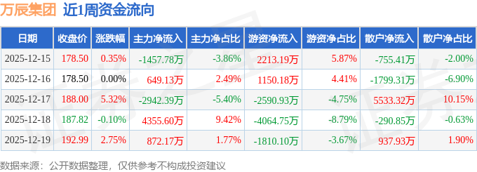 资金流向数据方面,本周万辰集团主力资金合计净流入1476.73万元,游资资金合计净流出5102.41万元,散户资金合计净流入3625.68万元。本周资金流向一览见下表: