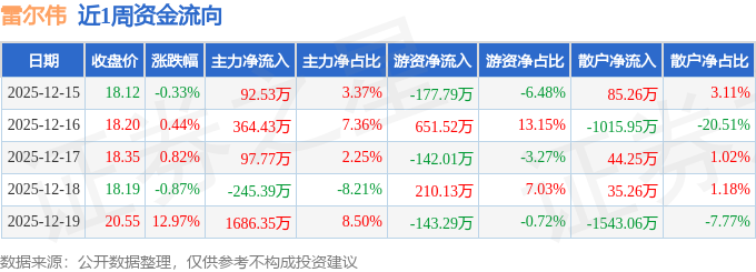资金流向数据方面,本周雷尔伟主力资金合计净流入1995.68万元,游资资金合计净流入398.56万元,散户资金合计净流出2394.23万元。本周资金流向一览见下表: