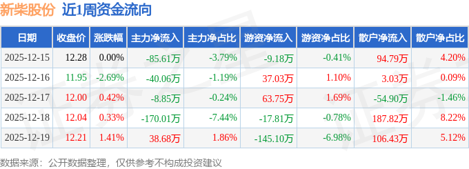 资金流向数据方面,本周新柴股份主力资金合计净流出265.86万元,游资资金合计净流出71.31万元,散户资金合计净流入337.17万元。本周资金流向一览见下表:
