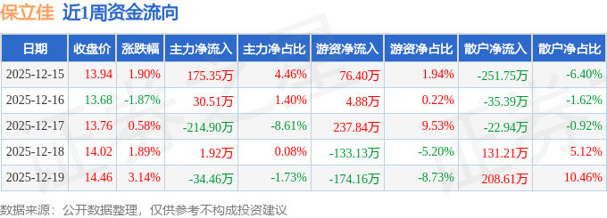 资金流向数据方面,本周保立佳主力资金合计净流出41.57万元,游资资金合计净流入11.83万元,散户资金合计净流入29.74万元。本周资金流向一览见下表: