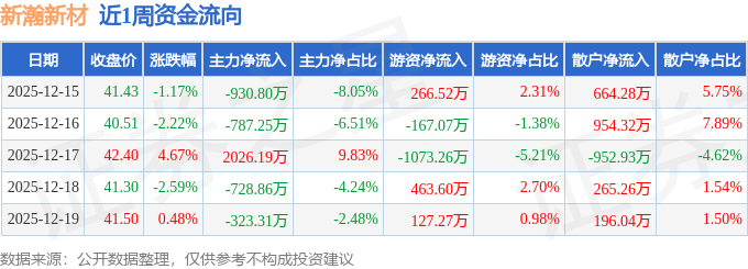 资金流向数据方面,本周新瀚新材主力资金合计净流出744.03万元,游资资金合计净流出382.94万元,散户资金合计净流入1126.97万元。本周资金流向一览见下表: