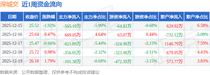 资金流向数据方面,本周深城交主力资金合计净流出1175.37万元,游资资金合计净流出1122.94万元,散户资金合计净流入2298.31万元。本周资金流向一览见下表: