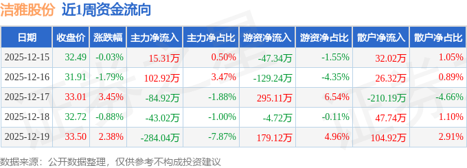 资金流向数据方面,本周洁雅股份主力资金合计净流出293.75万元,游资资金合计净流入292.93万元,散户资金合计净流入0.81万元。本周资金流向一览见下表: