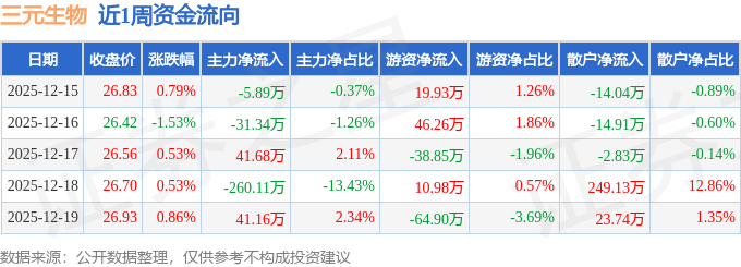 资金流向数据方面,本周三元生物主力资金合计净流出214.49万元,游资资金合计净流出26.58万元,散户资金合计净流入241.08万元。本周资金流向一览见下表: