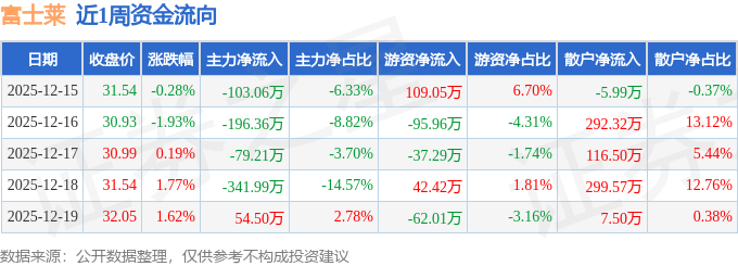 资金流向数据方面,本周富士莱主力资金合计净流出666.12万元,游资资金合计净流出43.79万元,散户资金合计净流入709.9万元。本周资金流向一览见下表: