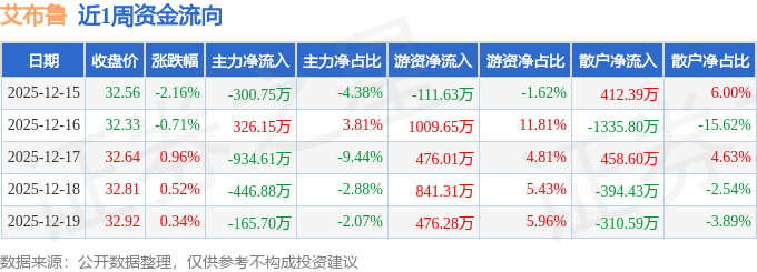 资金流向数据方面,本周艾布鲁主力资金合计净流出1521.78万元,游资资金合计净流入2691.61万元,散户资金合计净流出1169.83万元。本周资金流向一览见下表: