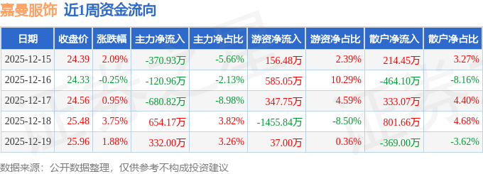 资金流向数据方面,本周嘉曼服饰主力资金合计净流出186.54万元,游资资金合计净流出329.55万元,散户资金合计净流入516.09万元。本周资金流向一览见下表: