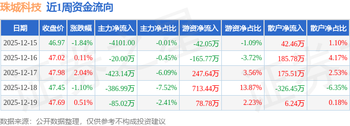 资金流向数据方面,本周珠城科技主力资金合计净流出915.57万元,游资资金合计净流入832.04万元,散户资金合计净流入83.54万元。本周资金流向一览见下表:
