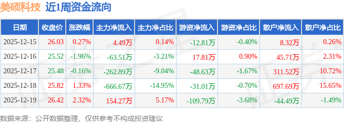 资金流向数据方面,本周美硕科技主力资金合计净流出834.31万元,游资资金合计净流出184.44万元,散户资金合计净流入1018.74万元。本周资金流向一览见下表: