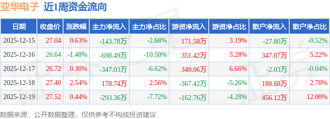 资金流向数据方面,本周亚华电子主力资金合计净流出1303.94万元,游资资金合计净流入341.88万元,散户资金合计净流入962.05万元。本周资金流向一览见下表: