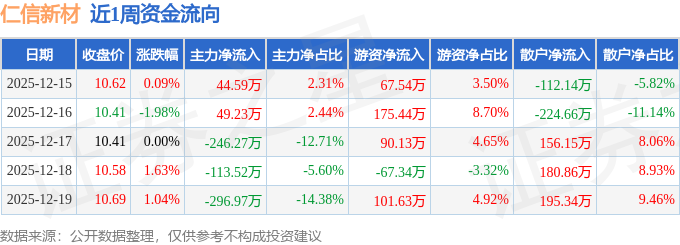 资金流向数据方面,本周仁信新材主力资金合计净流出562.95万元,游资资金合计净流入367.39万元,散户资金合计净流入195.55万元。本周资金流向一览见下表: