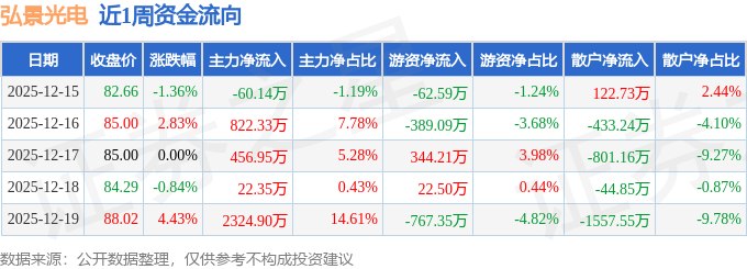 资金流向数据方面,本周弘景光电主力资金合计净流入3566.39万元,游资资金合计净流出852.32万元,散户资金合计净流出2714.07万元。本周资金流向一览见下表: