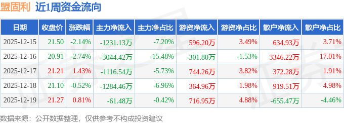 资金流向数据方面,本周盟固利主力资金合计净流出6738.04万元,游资资金合计净流入2120.57万元,散户资金合计净流入4617.47万元。本周资金流向一览见下表: