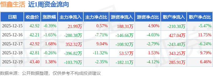 资金流向数据方面,本周恒鑫生活主力资金合计净流出406.68万元,游资资金合计净流出195.81万元,散户资金合计净流入602.49万元。本周资金流向一览见下表: