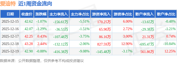 资金流向数据方面,本周爱迪特主力资金合计净流出849.12万元,游资资金合计净流入1004.43万元,散户资金合计净流出155.32万元。本周资金流向一览见下表: