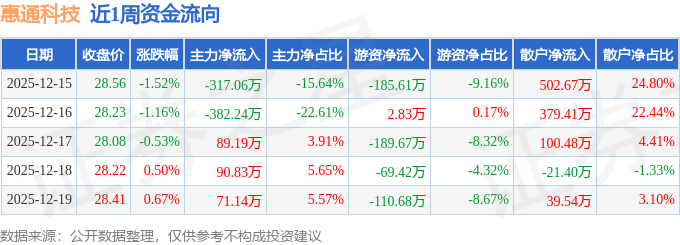 资金流向数据方面,本周惠通科技主力资金合计净流出448.15万元,游资资金合计净流出552.55万元,散户资金合计净流入1000.7万元。本周资金流向一览见下表: