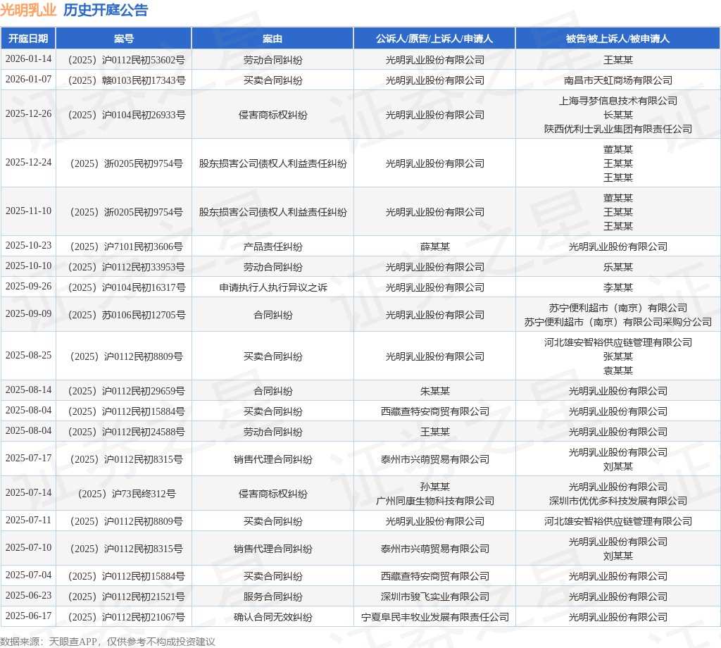 案号:(2025)浙0205民初9754号根据统计,近一年内以光明乳业股份有限公司为当事人的历史开庭公告有43则,其中案由为“买卖合同纠纷”的公告以12则居首,其次为“侵害商标权纠纷”有9则,“劳动合同纠纷”有7则。历史开庭公告(前20条)如下:
