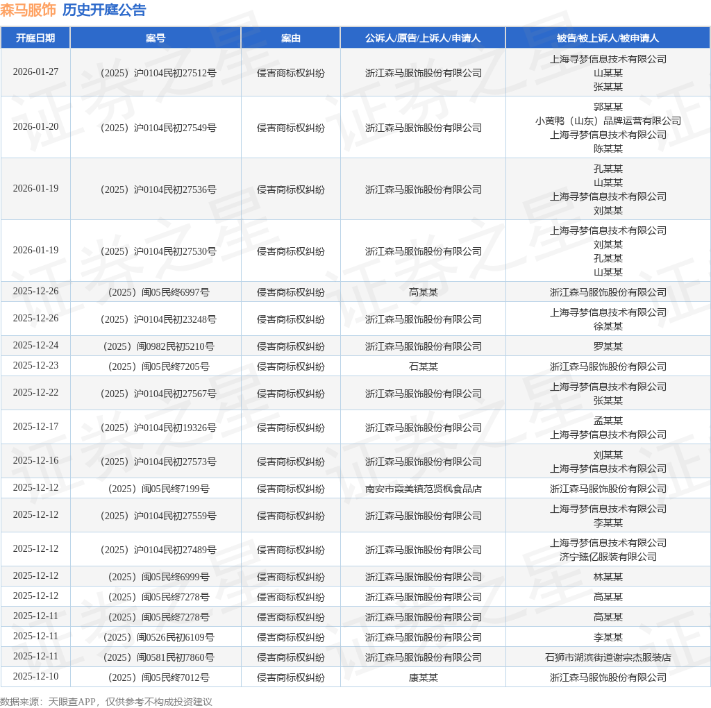案号:(2025)闽0982民初5210号根据统计,近一年内以浙江森马服饰股份有限公司为当事人的历史开庭公告有68则,其中案由为“侵害商标权纠纷”的公告以61则居首,其次为“侵害商标权”有5则,“侵害商标权及不正当竞争纠纷”有1则。历史开庭公告(前20条)如下: