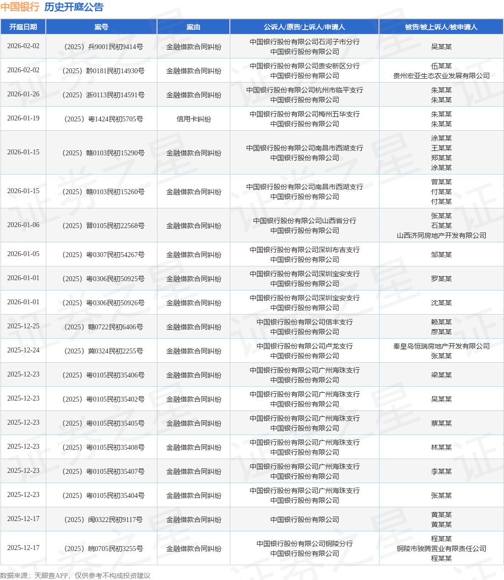案号:(2025)冀0324民初2255号根据统计,近一年内以中国银行股份有限公司为当事人的历史开庭公告有156则,其中案由为“金融借款合同纠纷”的公告以126则居首,其次为“信用卡纠纷”有17则,“借款合同纠纷”有4则。历史开庭公告(前20条)如下: