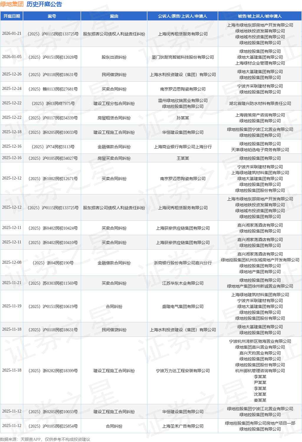 案号:(2025)赣0113民初27681号根据统计,近一年内以绿地控股集团有限公司为当事人的历史开庭公告有200则,其中案由为“建设工程施工合同纠纷”的公告以38则居首,其次为“金融借款合同纠纷”有24则,“合同纠纷”有18则。历史开庭公告(前20条)如下: