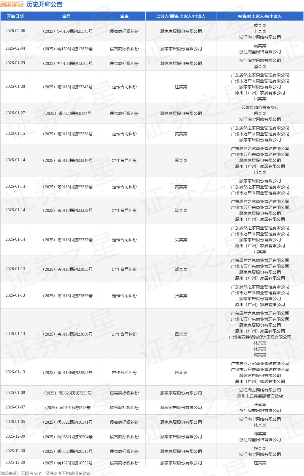 案号:(2025)闽05民终7149号根据统计,近一年内以顾家家居股份有限公司为当事人的历史开庭公告有220则,其中案由为“侵害商标权纠纷”的公告以174则居首,其次为“定作合同纠纷”有10则,“商标权权属、侵权纠纷”有7则。历史开庭公告(前20条)如下: